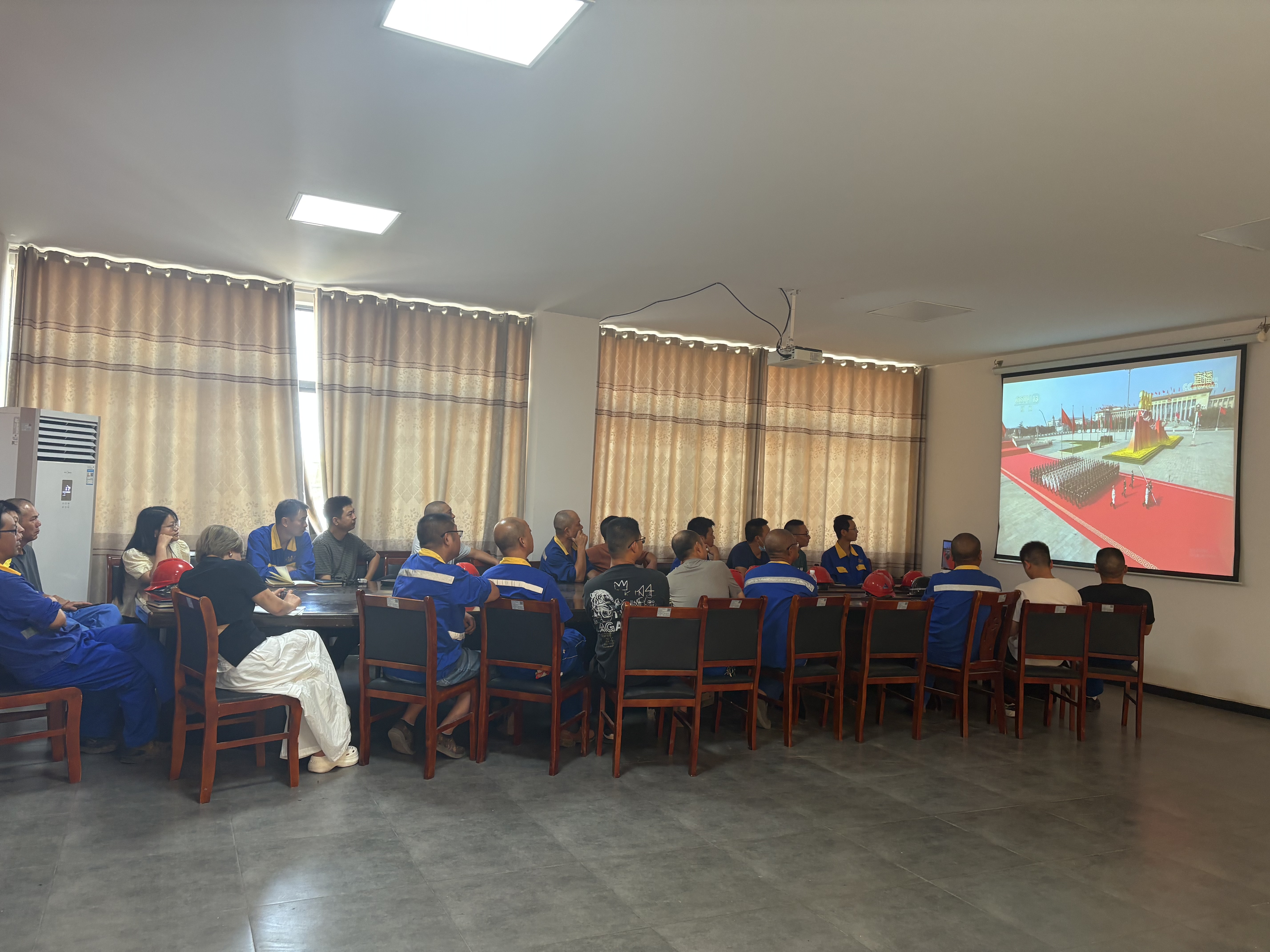 上午9時,大家準時聚集在各公司的會議室,自發(fā)整理好衣襟,眼神中滿是期待與肅穆。當直播畫面切到天安門廣場,鮮艷的五星紅旗在晨光中冉冉升起,激昂的歌聲里,是跨越代際的信仰傳承,是屬于京蘭人的集體共鳴。?